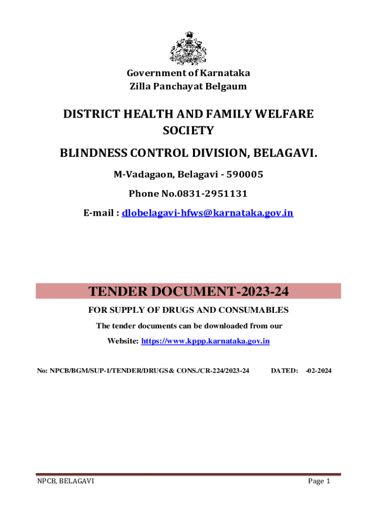 Government of Karnataka Zilla Panchayat BelgaumDISTRICT HEALTH AND FAMILY WELFARE SOCIETY BLINDNESS CONTROL DIVISION, BELAGAVI. MVadagaon, Belagavi 590005 Phone No.08312951131 Email : dlobelagavihfws@karnataka.gov.inTENDER