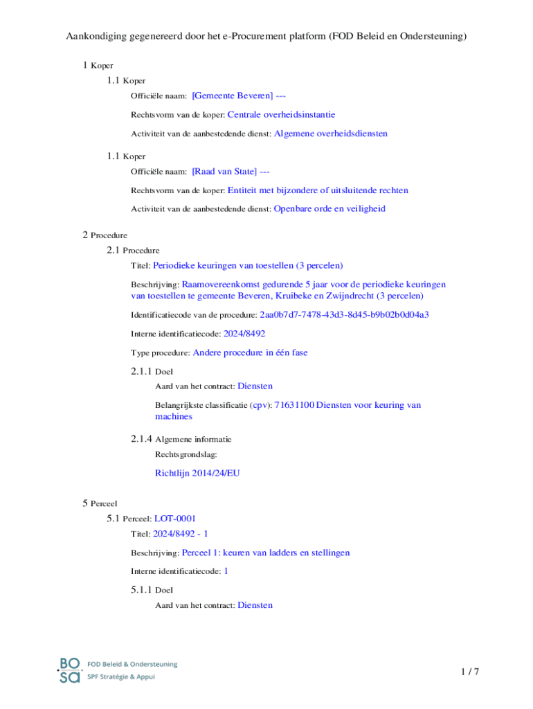 Aankondiging gegenereerd door het eProcurement platform (FOD Beleid en Ondersteuning) 1 Koper 1.1 Koper Officile naam: [Gemeente Beveren] Rechtsvorm van de koper: Centrale overheidsinstantie Activiteit
