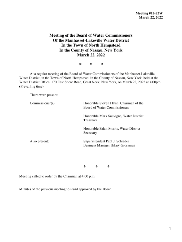 Meeting #1222W March 22, 2022Meeting of the Board of Water Commissioners Of the ManhassetLakeville Water District In the Town of North Hempstead In the County of Nassau, New York March 22, 2022***At