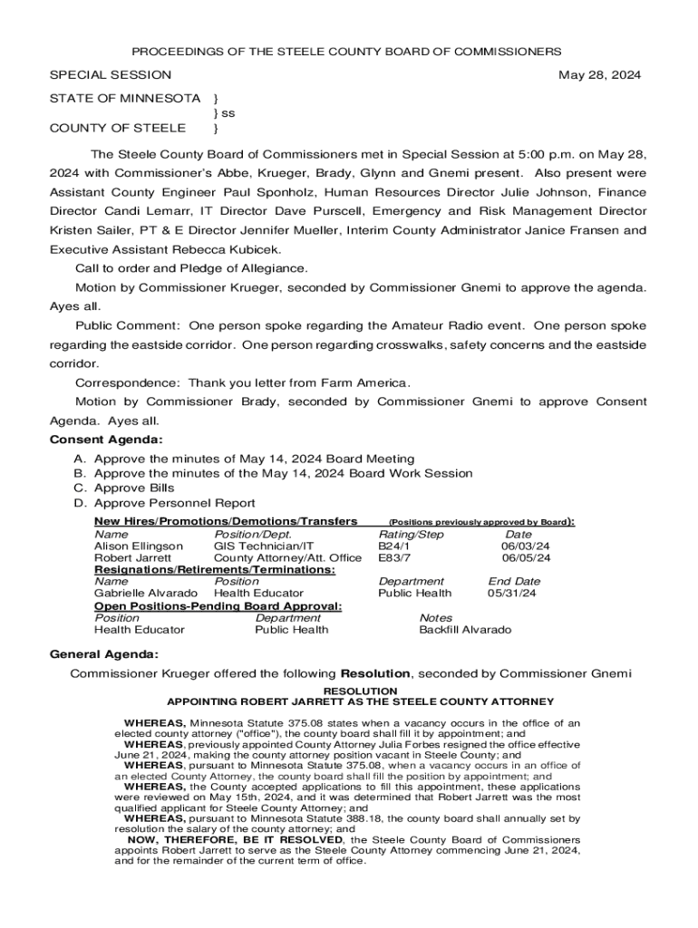 PROCEEDINGS OF THE STEELE COUNTY BOARD OF COMMISSIONERSSPECIAL SESSIONMay 28, 2024STATE OF MINNESOTA ss COUNTY OF STEELE The Steele County Board of Commissioners met in Special Session at 5:00 p.m.