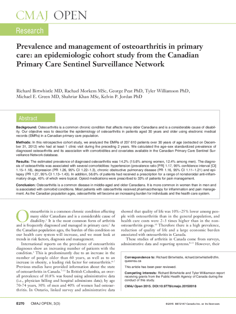 CMAJ OPEN Research Prevalence and management of osteoarthritis in primary care: an epidemiologic cohort study from the Canadian Primary Care Sentinel Surveillance NetworkRichard Birtwhistle MD, Rachael