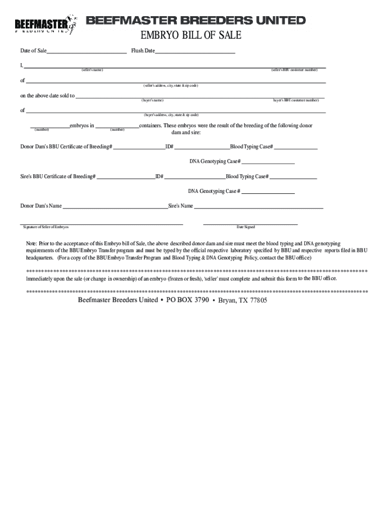 EMBRYO BILL OF SALE Flush DateDate of Sale I,(sellers name)(sellers BBU customer number)of (sellers address, city, state & zip code)on the above date sold to(buyers name)ofbuyers BBU customer number)(buyers