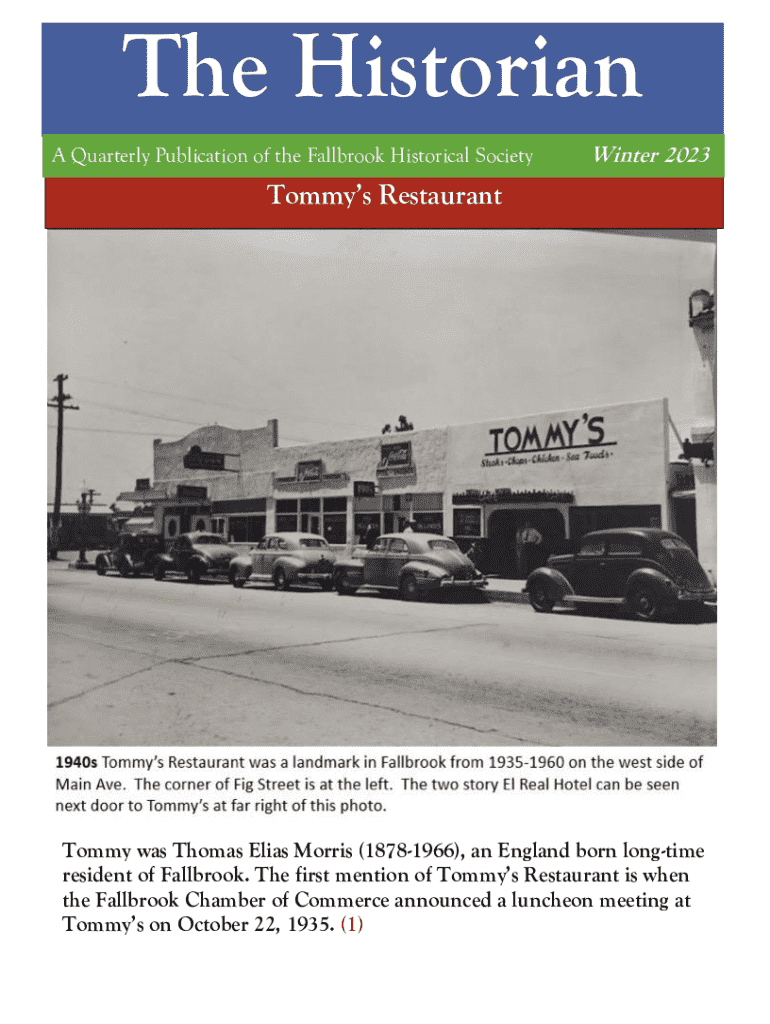 The Historian A Quarterly Publication of the Fallbrook Historical SocietyWinter 2023Tommys RestaurantTommy was Thomas Elias Morris (18781966), an England born longtime resident of Fallbrook. The first