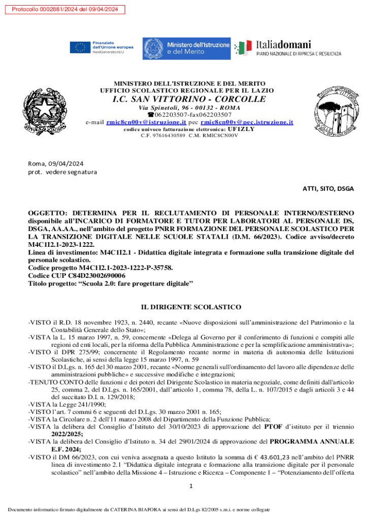 Protocollo 0002881/2024 del 09/04/2024MINISTERO DELLISTRUZIONE E DEL MERITO UFFICIO SCOLASTICO REGIONALE PER IL LAZIOI.C. SAN VITTORINO CORCOLLE Via Spinetoli, 96 00132 ROMA 062203507fax062203507