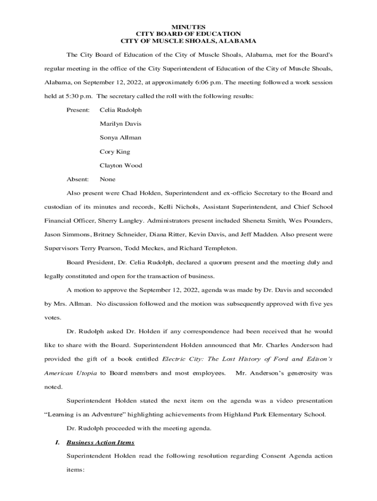 MINUTES CITY BOARD OF EDUCATION CITY OF MUSCLE SHOALS, ALABAMA The City Board of Education of the City of Muscle Shoals, Alabama, met for the Board\'s regular meeting in the office of the City Superintendent