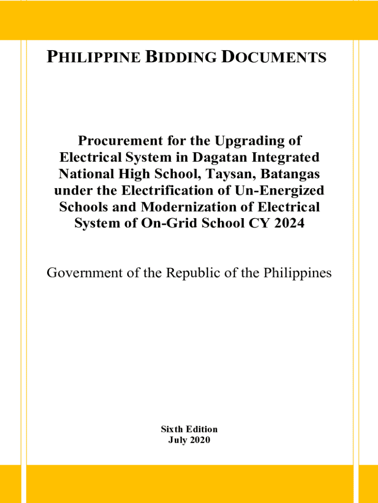 This document outlines the Philippine Bidding Documents (PBDs) for the procurement of the upgrading of the electrical system at Dagatan Integrated National High School as part of the Electrification of Un-Energized Schools and Modernization of Electrical System project for CY 2024. It serves as a guide through competitive bidding procedures and includes eligibility requirements, the submission process, and necessary documentation for potential bidders.