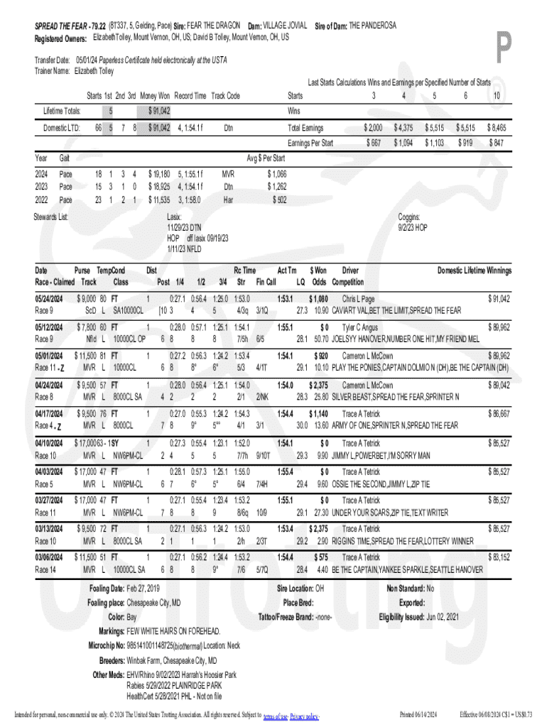This document contains detailed information on the harness racing horse named SPREAD THE FEAR, including ownership, lineage, race history, earnings, and performance statistics. It details the horse\'s race records, recent performances, health and medication history, and personal details. Additionally, it provides information about recent claims, training data, and various race conditions and results.