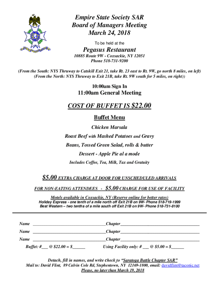 Empire State Society SAR Board of Managers Meeting March 24, 2018 To be held at thePegasus Restaurant 10885 Route 9W Coxsackie, NY 12051 Phone 5187319200 (From the South: NYS Thruway to Catskill Exit