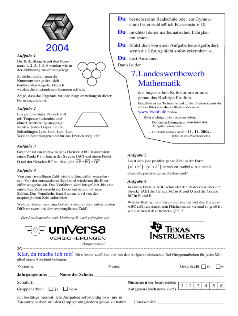 2004 Aufgabe 1 Die Billardkugeln mit den Nummern 1, 2, 3, 4, 5, 6 werden wie in der Abbildung zusammengelegt.Dubesuchst eine Realschule oder ein Gymnasium bis einschlielich Klassenstufe 10.Dumchtest