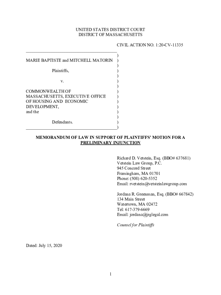UNITED STATES DISTRICT COURT DISTRICT OF MASSACHUSETTS CIVIL ACTION NO. 1:20CV11335 ___ ) MARIE BAPTISTE and MITCHELL MATORIN ) ) Plaintiffs, ) ) v. ) ) COMMONWEALTH OF ) MASSACHUSETTS, EXECUTIVE