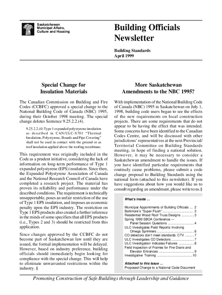 Saskatchewan Municipal Affairs, Culture and HousingBuilding Officials Newsletter Building Standards April 1999Special Change for Insulation MaterialsMore Saskatchewan Amendments to the NBC 1995?The