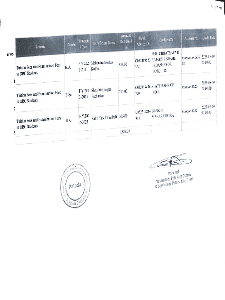 AmountCourseSchemeFinancia IYearBeneficiary NumeDisbursed ToDebitSHRICHHATRAPATIsr noFees Tuition Fees and Examination to OBC StudentsB.A.F.Y.202Mahendra Keshav22023KollheCOS2319823 RAJARSHISHAHU