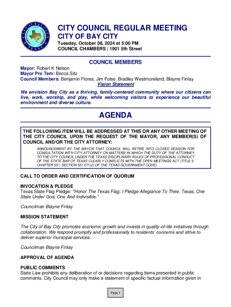 CITY COUNCIL REGULAR MEETING CITY OF BAY CITY Tuesday, October 08, 2024 at 5:00 PM COUNCIL CHAMBERS | 1901 5th StreetCOUNCIL MEMBERS Mayor: Robert K Nelson Mayor Pro Tem: Becca Sitz Council Members: