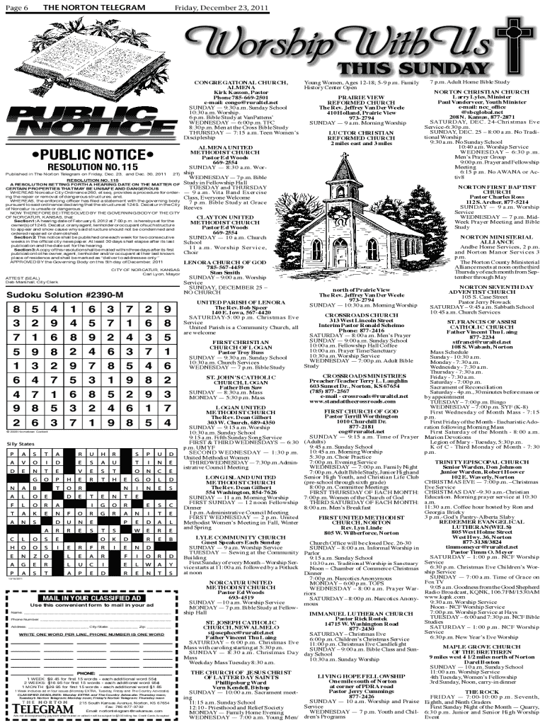 THE NORTON TELEGRAMPage 6Friday, December 23, 2011PUBLIC NOTICE RESOLUTION NO. 115Published in The Norton Telegram on Friday, Dec. 23, and Dec. 30, 20112T)RESOLUTION NO. 115 A RESOLUTION SETTING FORTH