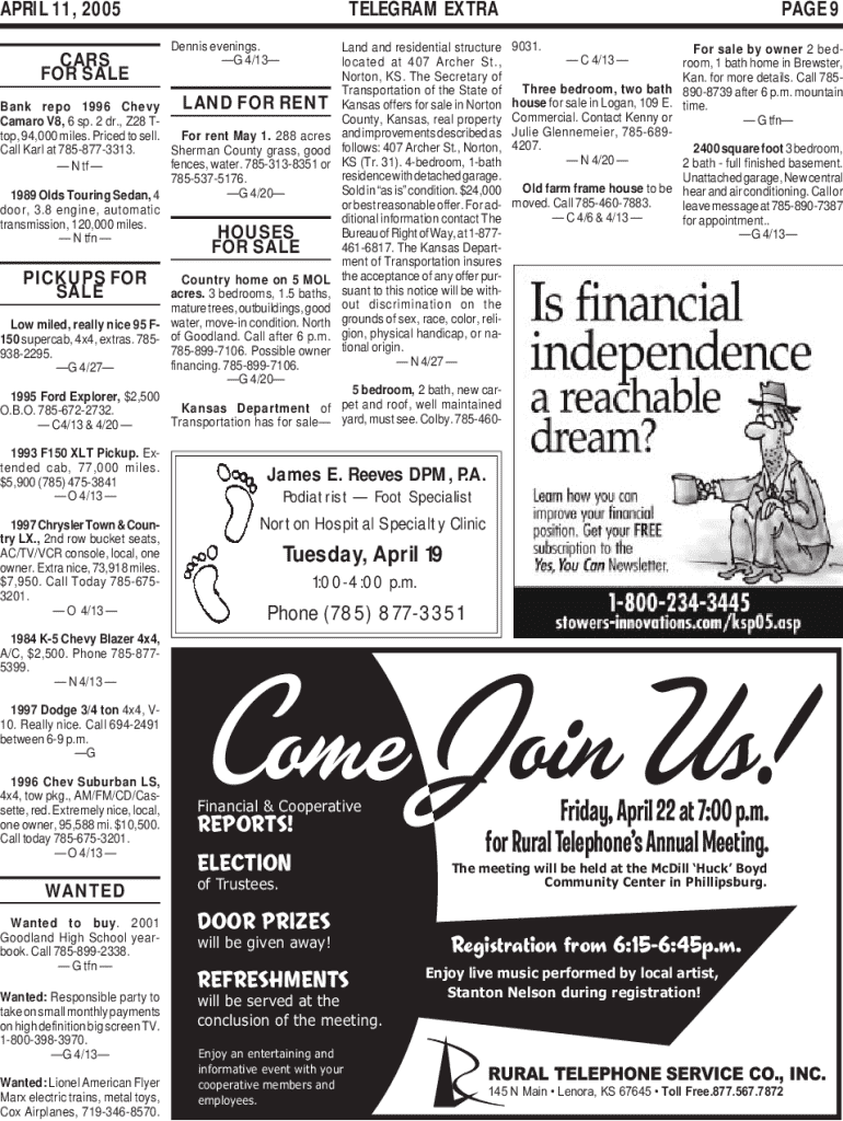 APRIL 11, 2005 CARS FOR SALETELEGRAM EXTRA Dennis evenings. G 4/13LAND FOR RENT Bank repo 1996 Chevy Camaro V8, 6 sp. 2 dr., Z28 Ttop, 94,000 miles. Priced to sell. For rent May 1. 288 acres Call