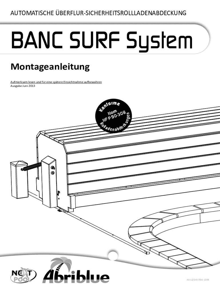 AUTOMATISCHE BERFLURSICHERHEITSROLLLADENABDECKUNGBANC SURF System MontageanleitungKoAufmerksam lesen und fr eine sptere Einsichtnahme aufbewahren Ausgabe Juni 2013n formeRoll akungenNorm308 90 NF