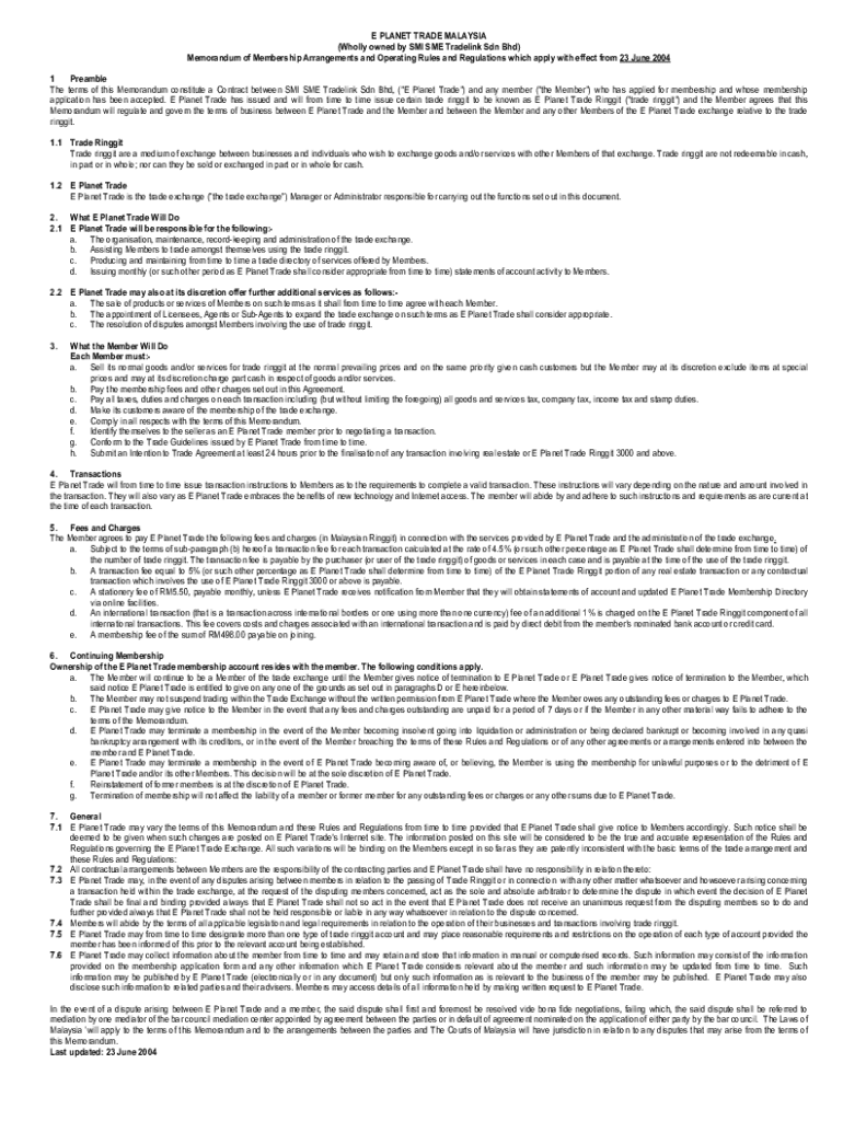 This document outlines the terms of membership, operational rules, and regulations for E Planet Trade Malaysia, a trade exchange managed by SMI SME Tradelink Sdn Bhd. It details the responsibilities of both the members and E Planet Trade, including the use of a non-redeemable currency known as Trade Ringgit, transaction fees, membership conditions, and procedures for resolving disputes.
