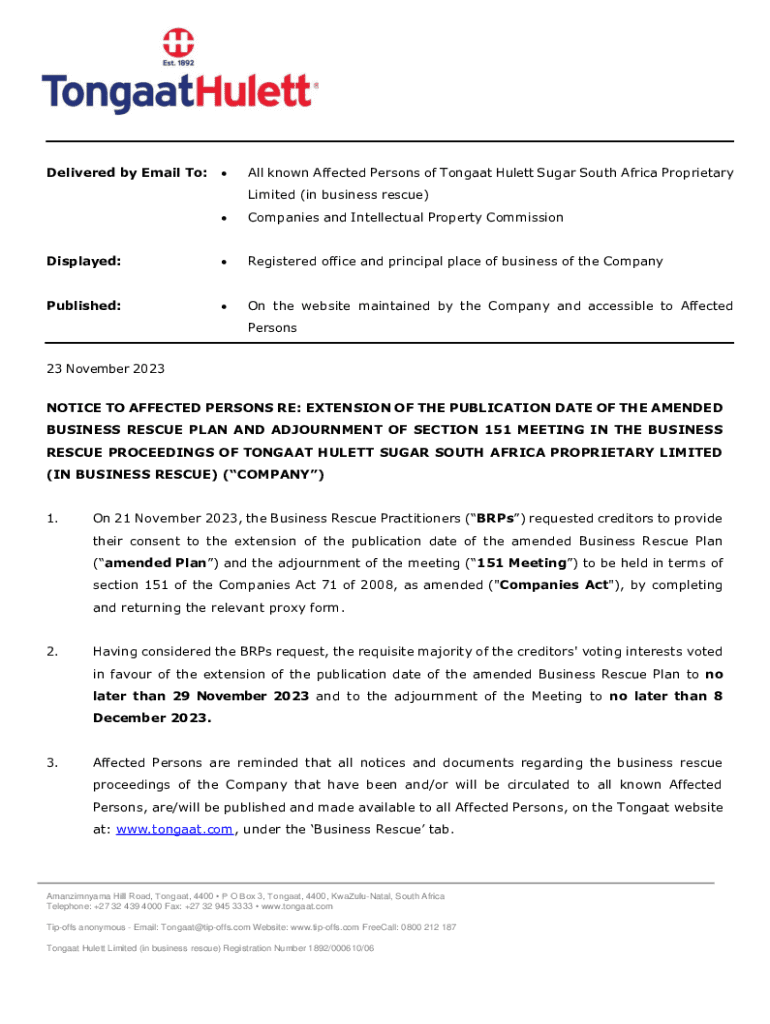 Delivered by Email To:All known Affected Persons of Tongaat Hulett Sugar South Africa Proprietary Limited (in business rescue)Companies and Intellectual Property CommissionDisplayed:Registered office