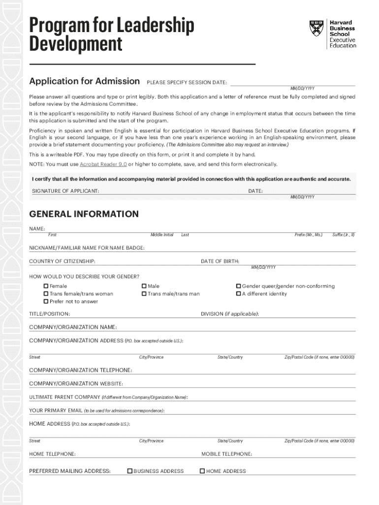 This document is an application form for admission into the Program for Leadership Development at Harvard Business School. It includes instructions for filling out the form, sections for personal information, work experience, educational background, and letters of reference. It emphasizes the importance of English proficiency and outlines the policies regarding payment, cancellation, and deferral.