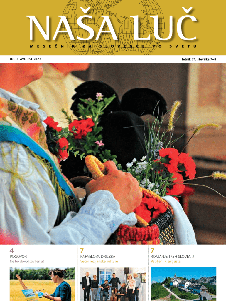 julijavgust 20224Pogovor Ne bo dovolj ivljenja!letnik 71, tevilka 787Rafaelova druba Veer rezijanske kulture7ROMANJE TREH SLOVENIJ Vabljeni 7. avgusta!PONUDBA ZALOBE DRUINA OB DNEVU DRAVNOSTI Pri