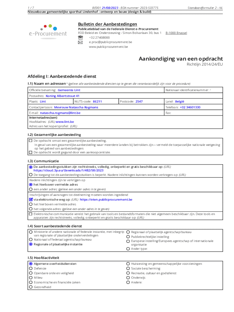 1/7 BE001 21/08/2023 BDA nummer: 2023533775 Nieuwbouw gemeentelijke sporthal Lindenhof : ontwerp en bouw (design & build)Standaardformulier 2 NLBulletin der Aanbestedingen Publicatieblad van de Federale