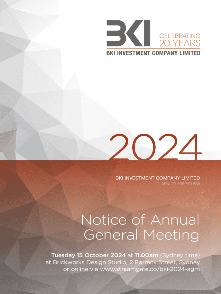 This document serves as the official notice for the 21st Annual General Meeting (AGM) of BKI Investment Company Limited, scheduled to be held on 15 October 2024 at 11:00am in Sydney. It includes details about the meeting venue, schedule, agenda for the meeting, and instructions for shareholders regarding voting and proxy appointments.