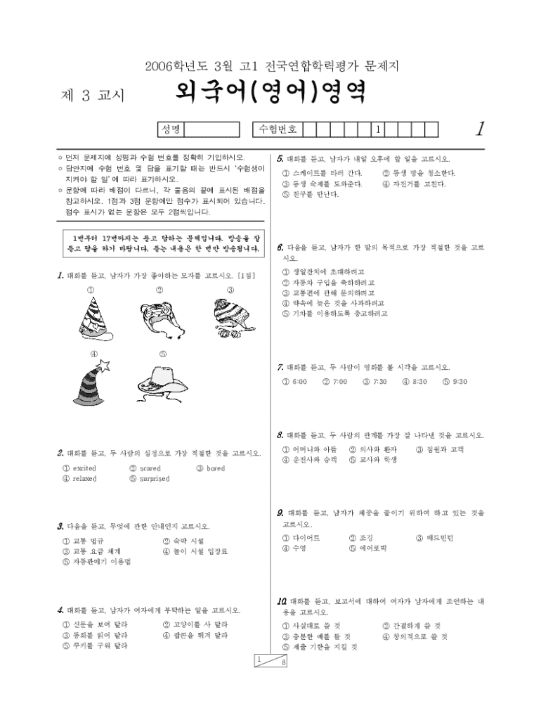 This document contains the examination questions for the English language section of the National Academic Ability Evaluation for first-year high school students in South Korea for the year 2006. It includes listening comprehension tasks, multiple choice questions, and other exercises aimed at assessing students\' understanding of English.