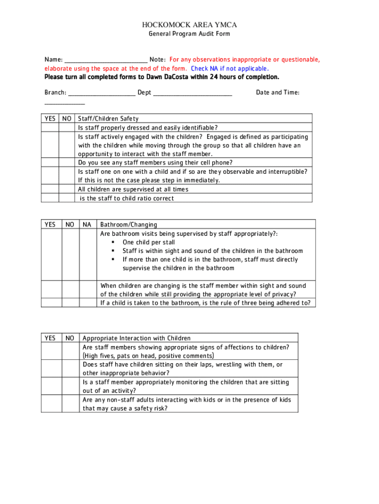 HOCKOMOCK AREA YMCA General Program Audit FormName: ___ Note: For any observations inappropriate or questionable, elaborate using the space at the end of the form. Check NA if not applicable. Please