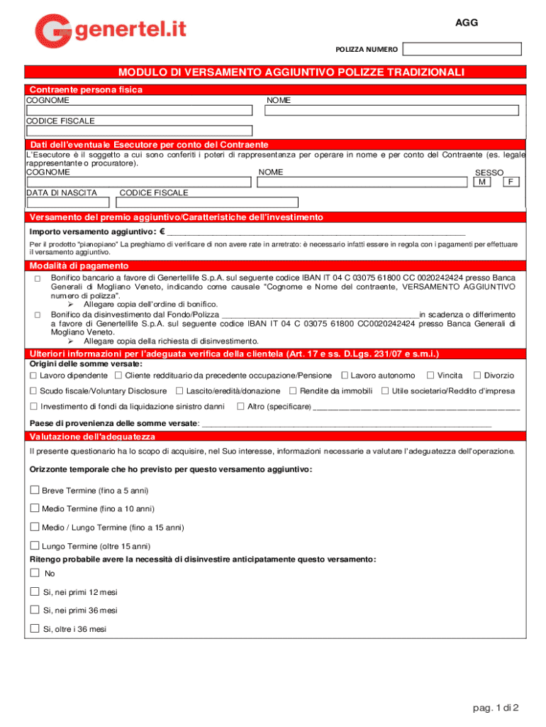 AGG POLIZZA NUMEROMODULO DI VERSAMENTO AGGIUNTIVO POLIZZE TRADIZIONALI Contraente persona fisica COGNOMENOMECODICE FISCALEDati delleventuale Esecutore per conto del Contraente LEsecutore il soggetto