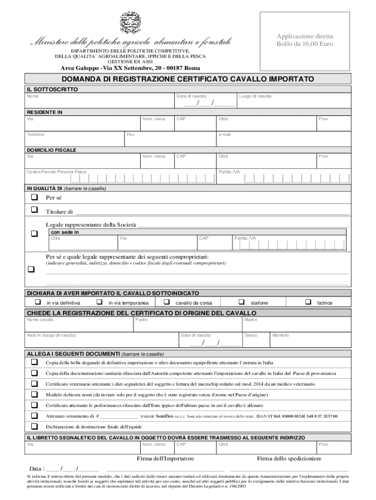 Applicazione diretta Bollo da 16,00 EuroMinistero delle politiche agricole alimentari e forestali DIPARTIMENTO DELLE POLITICHE COMPETITIVE, DELLA QUALITA AGROALIMENTARE, IPPICHE E DELLA PESCA GESTIONE