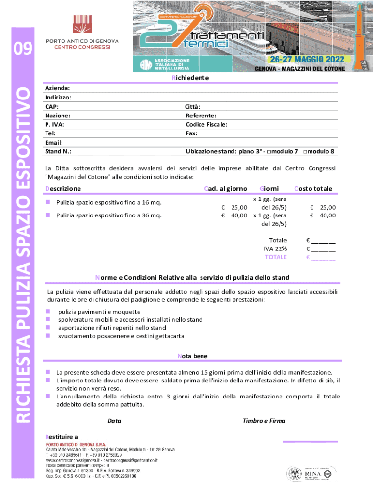 Richiedente Azienda: Indirizzo: CAP: Nazione: P. IVA: Tel: Email: Stand N.:Citt: Referente: Codice Fiscale: Fax: Ubicazione stand: piano 3 modulo 7 modulo 8La Ditta sottoscritta desidera avvalersi