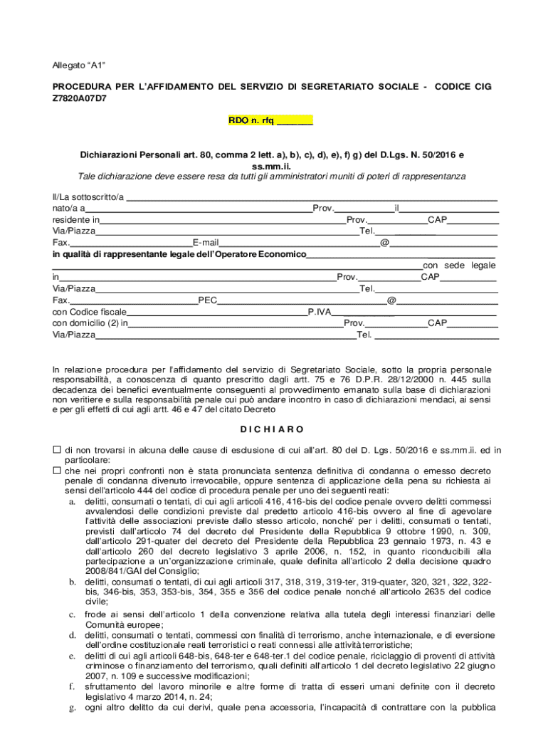 Allegato A1 PROCEDURA PER LAFFIDAMENTO DEL SERVIZIO DI SEGRETARIATO SOCIALE CODICE CIG Z7820A07D7 RDO n. rfq ___Dichiarazioni Personali art. 80, comma 2 lett. a), b), c), d), e), f) g) del D.Lgs.