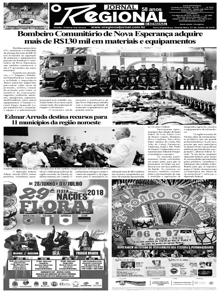 58 anosNOVA ESPERANA Fundado em 03/04/60 Ano 58 ............. N 2978 Rua Lord Lovat n 500 Telefax (44) 32521177 Telefone (44) 991111871 COLORADO Fundado em 25/12/76 Ano 42 ......... N 2065 Rua Dep.