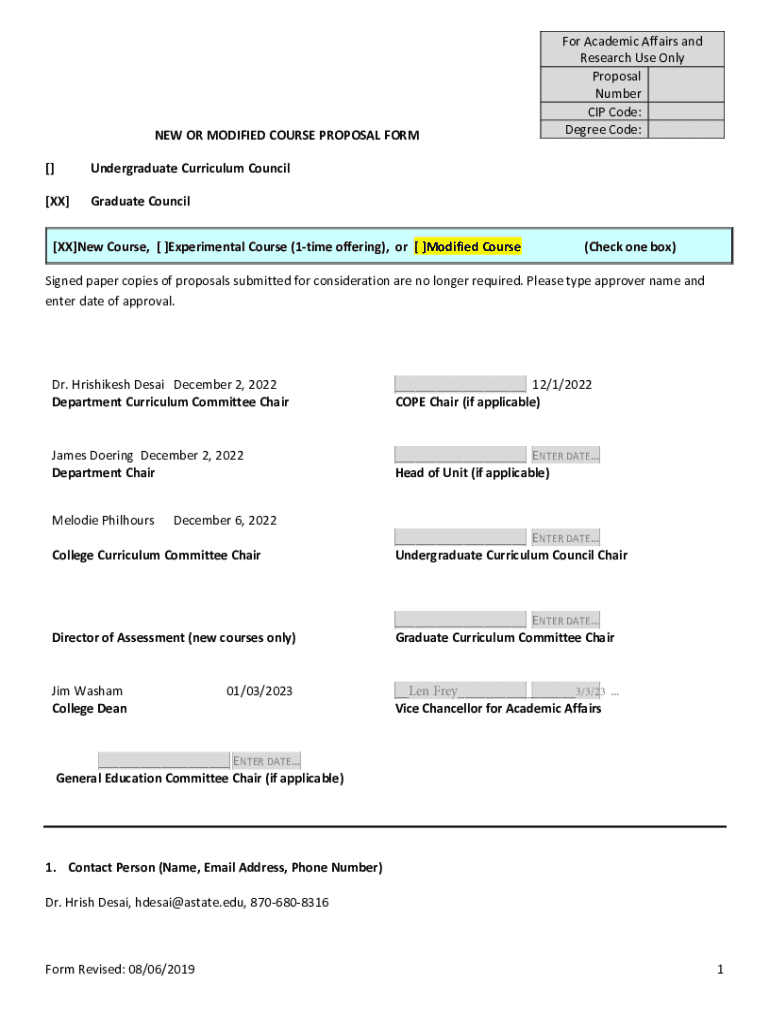 NEW OR MODIFIED COURSE PROPOSAL FORM []Undergraduate Curriculum Council[XX]Graduate Council[XX]New Course, [ ]Experimental Course (1time offering), or [ ]Modified CourseFor Academic Affairs and Research