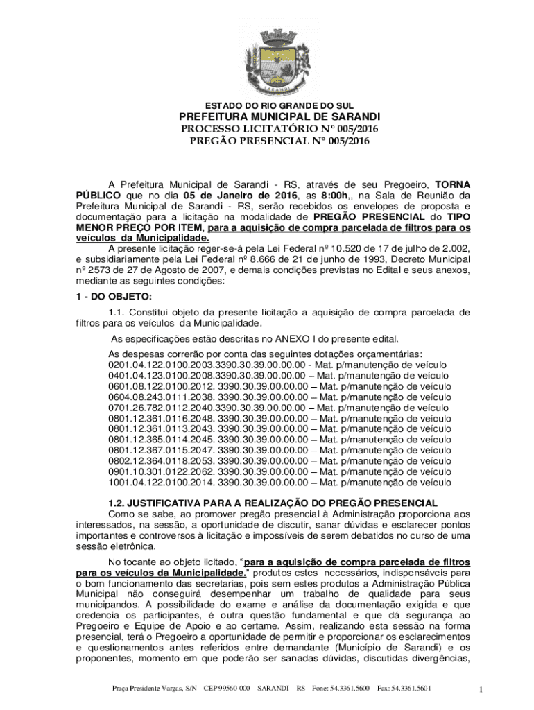 ESTADO DO RIO GRANDE DO SULPREFEITURA MUNICIPAL DE SARANDI PROCESSO LICITATRIO N 005/2016 PREGO PRESENCIAL N 005/2016A Prefeitura Municipal de Sarandi RS, atravs de seu Pregoeiro, TORNA PBLICO que