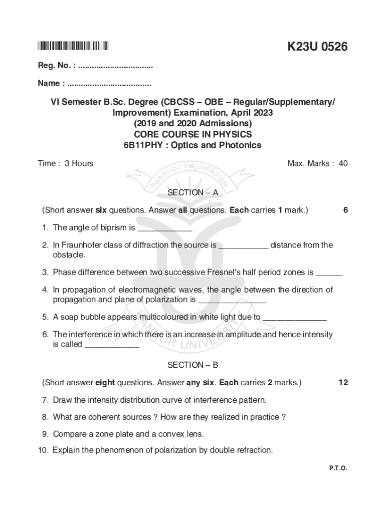 This document outlines the examination structure and questions for the Core Course in Optics and Photonics as part of the VI semester B.Sc. Degree CBCSS – OBE program. It includes various sections with short answer questions, problems, and essays related to the topics of optics and photonics.
