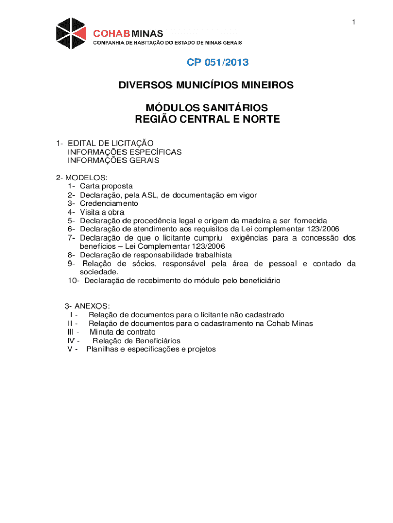 1CP 051/2013 DIVERSOS MUNICPIOS MINEIROS MDULOS SANITRIOS REGIO CENTRAL E NORTE 1 EDITAL DE LICITAO INFORMAES ESPECFICAS INFORMAES GERAIS 2 MODELOS: 1 Carta proposta 2 Declarao, pela ASL, de documentao