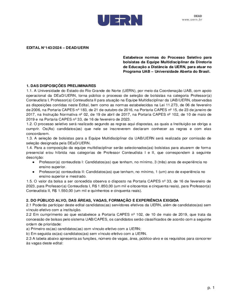 EDITAL N143/2024 DEAD/UERN Estabelece normas do Processo Seletivo para bolsistas da Equipe Multidisciplinar da Diretoria de Educao a Distncia da UERN, para atuar no Programa UAB Universidade Aberta
