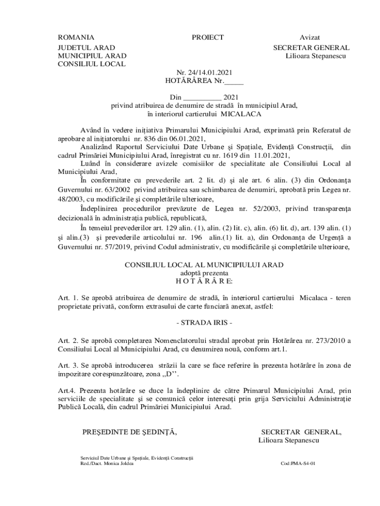 ROMANIA JUDETUL ARAD MUNICIPIUL ARAD CONSILIUL LOCALPROIECTAvizat SECRETAR GENERAL Lilioara StepanescuNr. 24/14.01.2021 HOTRREA Nr.___ Din ___ 2021 privind atribuirea de denumire de strad n municipiul