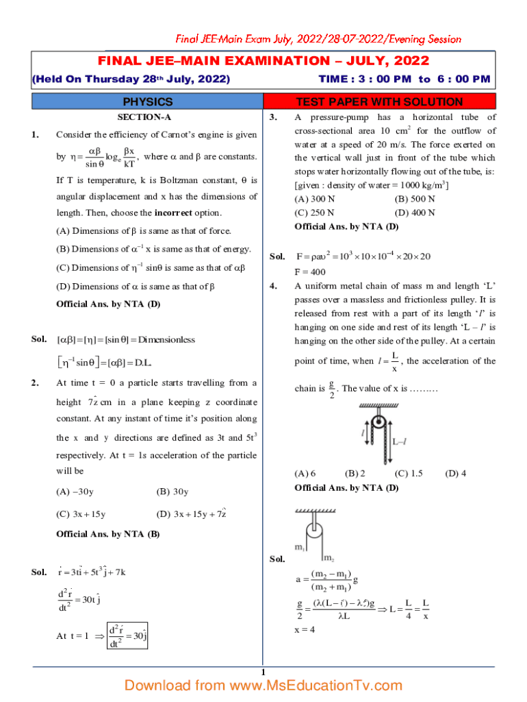 Get the free JEE MAIN 2022 (July Attempt) Answer Key & Solutions - Motion