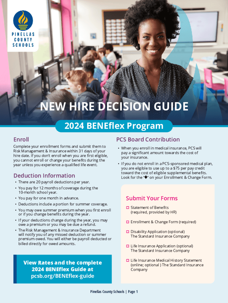 NEW HIRE DECISION GUIDE 2024 BENEflex Program EnrollPCS Board ContributionComplete your enrollment forms and submit them to Risk Management & Insurance within 31 days of your hire date. If you dont