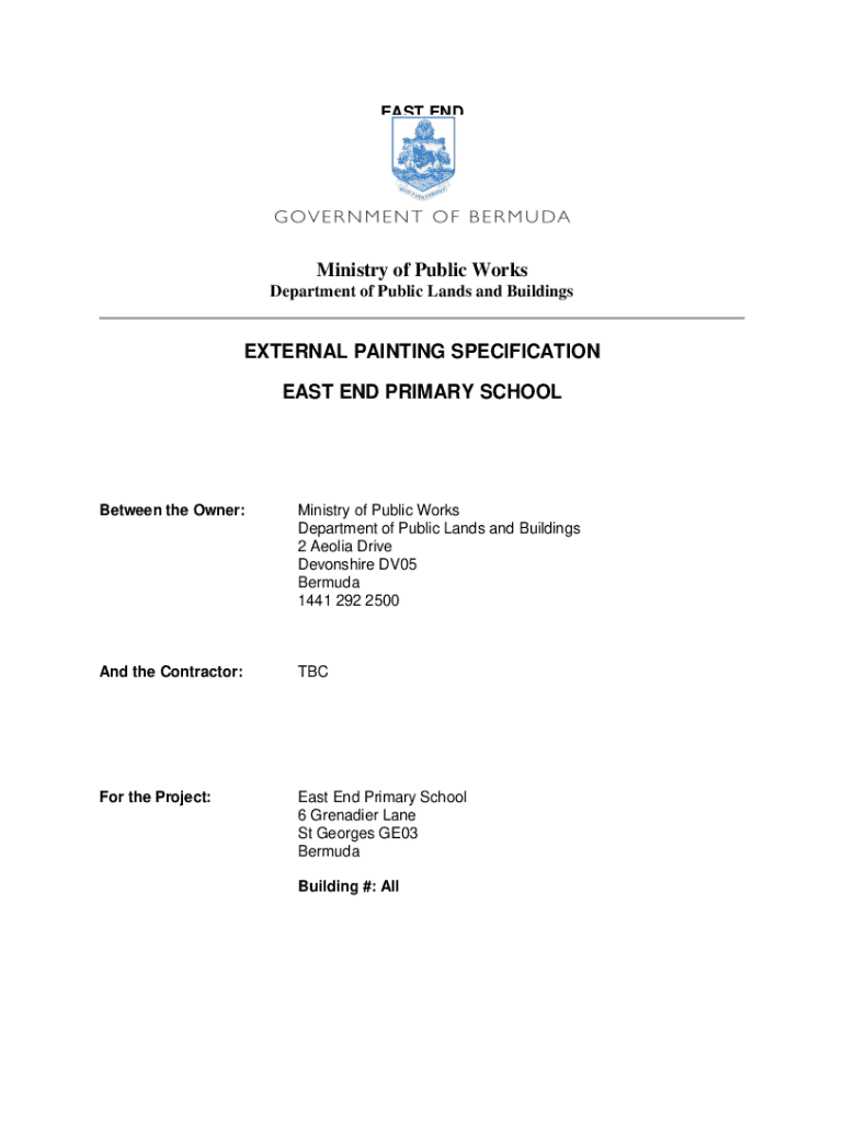This document provides the specifications and requirements for the external painting project at East End Primary School. It outlines the general requirements, masonry work, roofing specifications, and finishes needed in compliance with building codes. The project aims to enhance the aesthetic and functional aspects of the school’s exterior while preserving existing murals.