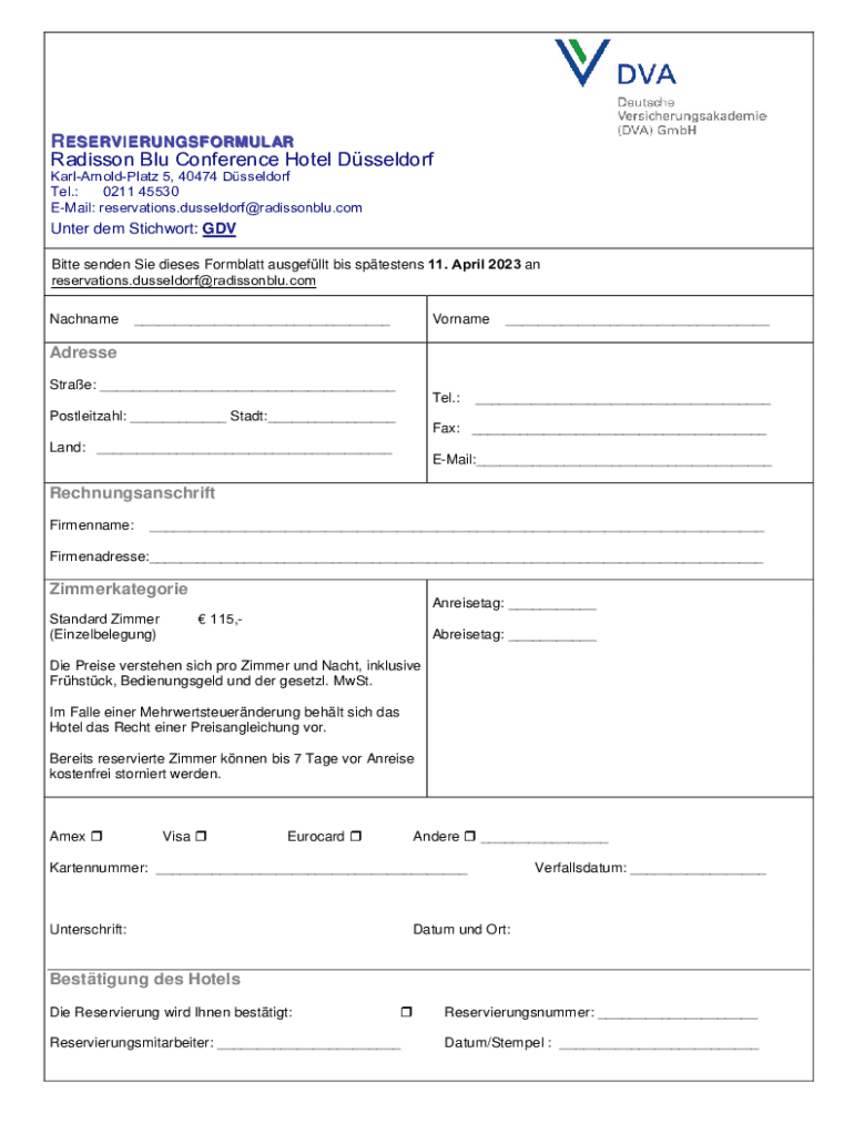 RE S E R V I E R U N G S F O R M U L AR Radisson Blu Conference Hotel Dsseldorf KarlArnoldPlatz 5, 40474 Dsseldorf Tel.: 0211 45530 EMail: reservations.dusseldorf@radissonblu.comUnter dem Stichwort: