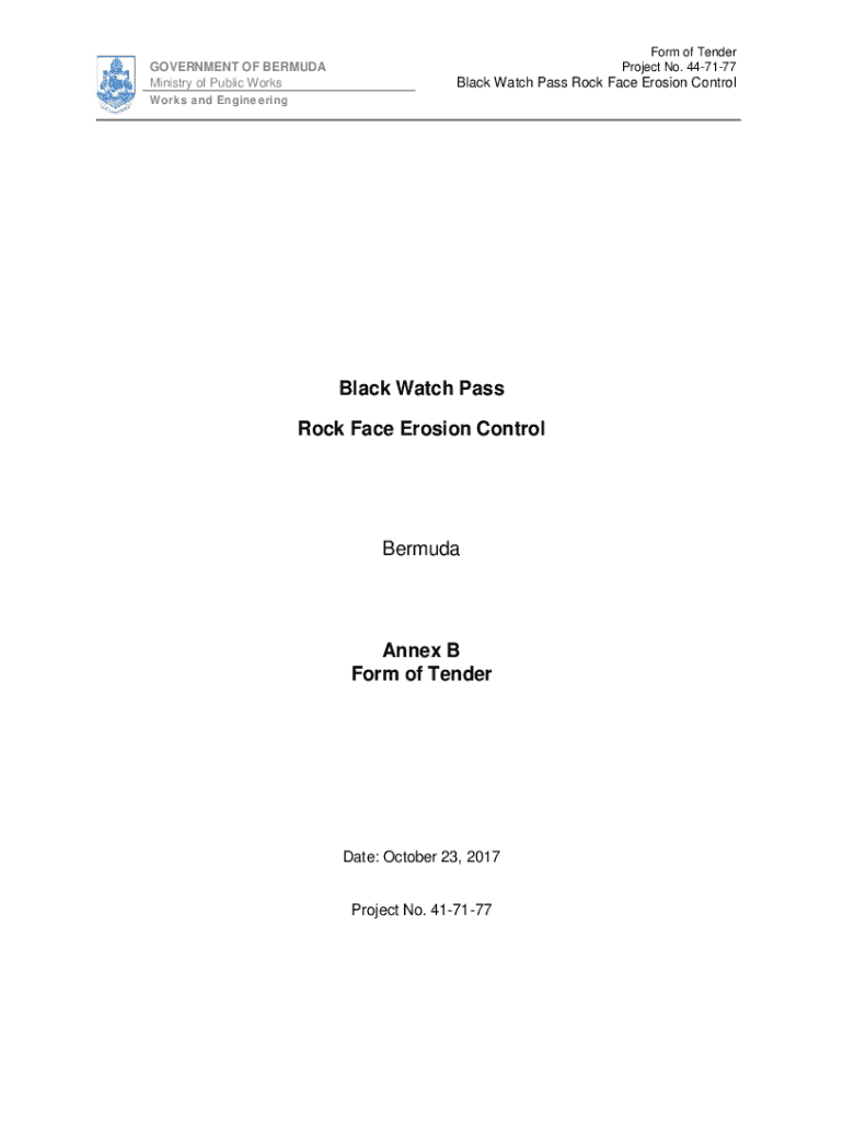 This document is a tender submission form for the Black Watch Pass Rock Face Erosion Control project, managed by the Government of Bermuda\'s Ministry of Public Works. It details the conditions under which bids are submitted, confirms non-collusion, and requests information regarding the bidding company, including financial qualifications and previous experience. The tender must be completed and returned as part of the bidding process, and it outlines the requirements and legal obligations of...