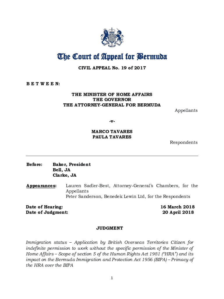 This document outlines the proceedings of a civil appeal regarding immigration status involving the Minister of Home Affairs, the Governor, and the Attorney-General for Bermuda against Marco and Paula Tavares. It addresses issues related to the application for indefinite permission to work in Bermuda, the interpretation of the Human Rights Act 1981, and its implications on the Bermuda Immigration and Protection Act 1956.