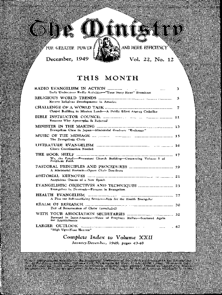 rFOR GREATER POWERAND MORE EFFICIENCY1December, 1949Vol. 22, No. 12THIS MONTH RADIO EVANGELISM IN ACTION ...................................................3Early Undercover Radio Activities \"Your