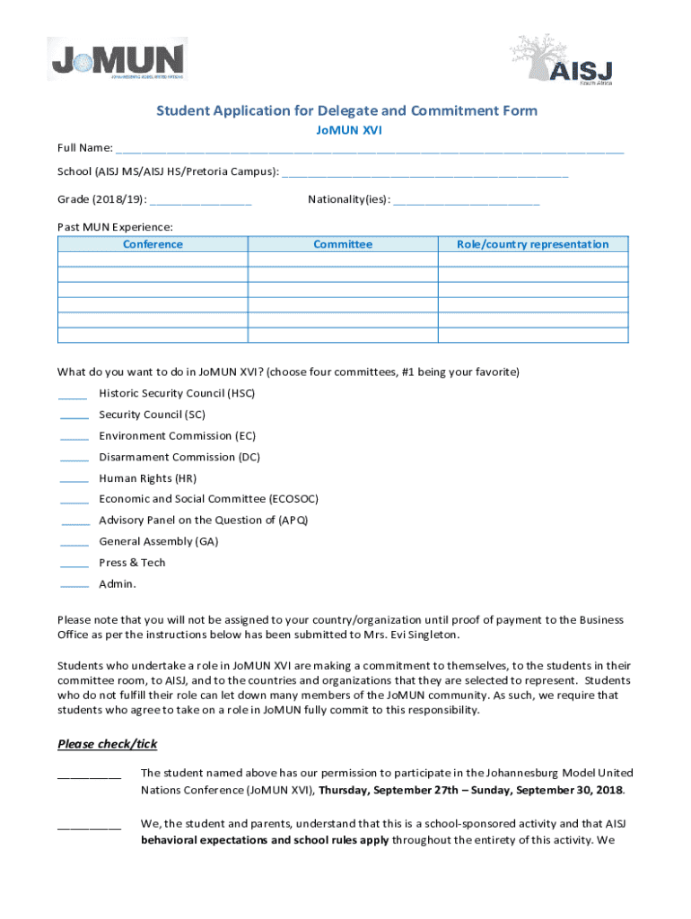 Student Application for Delegate and Commitment Form JoMUN XVI Full Name: ___ School (AISJ MS/AISJ HS/Pretoria Campus): ___ Grade (2018/19): ___Nationality(ies): ___Past MUN Experience: ConferenceCommitteeRole/country