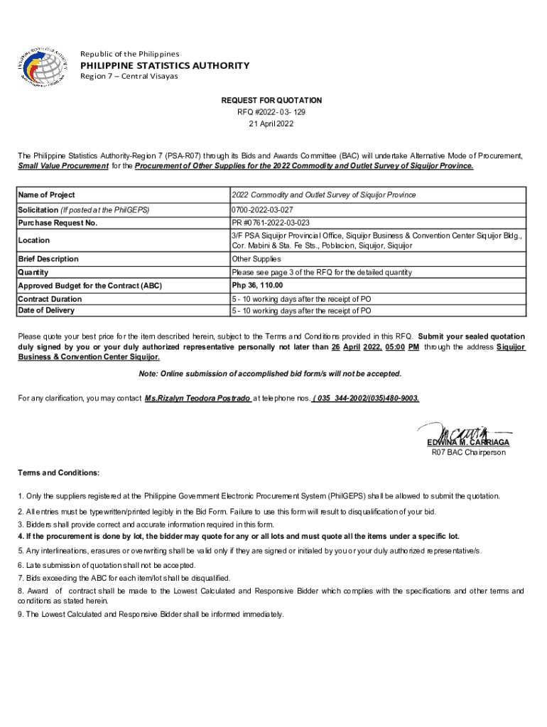 Republic of the PhilippinesPHILIPPINE STATISTICS AUTHORITY Region 7 Central Visayas REQUEST FOR QUOTATION RFQ #2022 03 129 21 April 2022The Philippine Statistics AuthorityRegion 7 (PSAR07) through