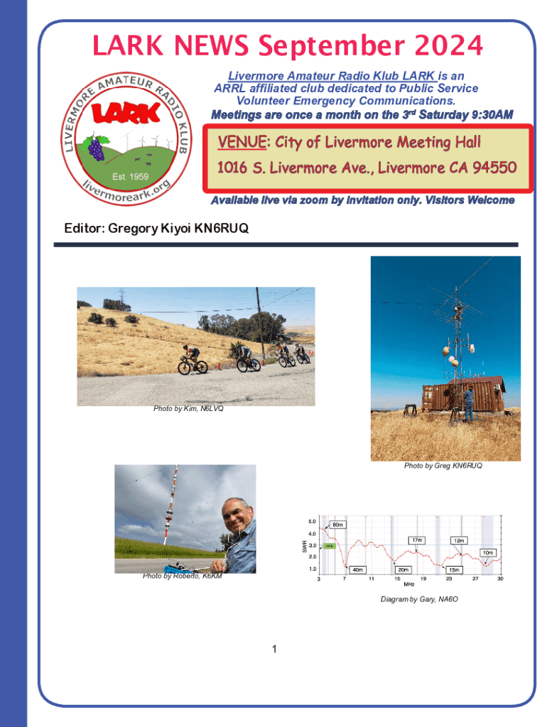 LARK NEWS September 2024 Livermore Amateur Radio Klub LARK is an ARRL affiliated club dedicated to Public Service Volunteer Emergency Communications. Meetings are once a month on the 3rd Saturday