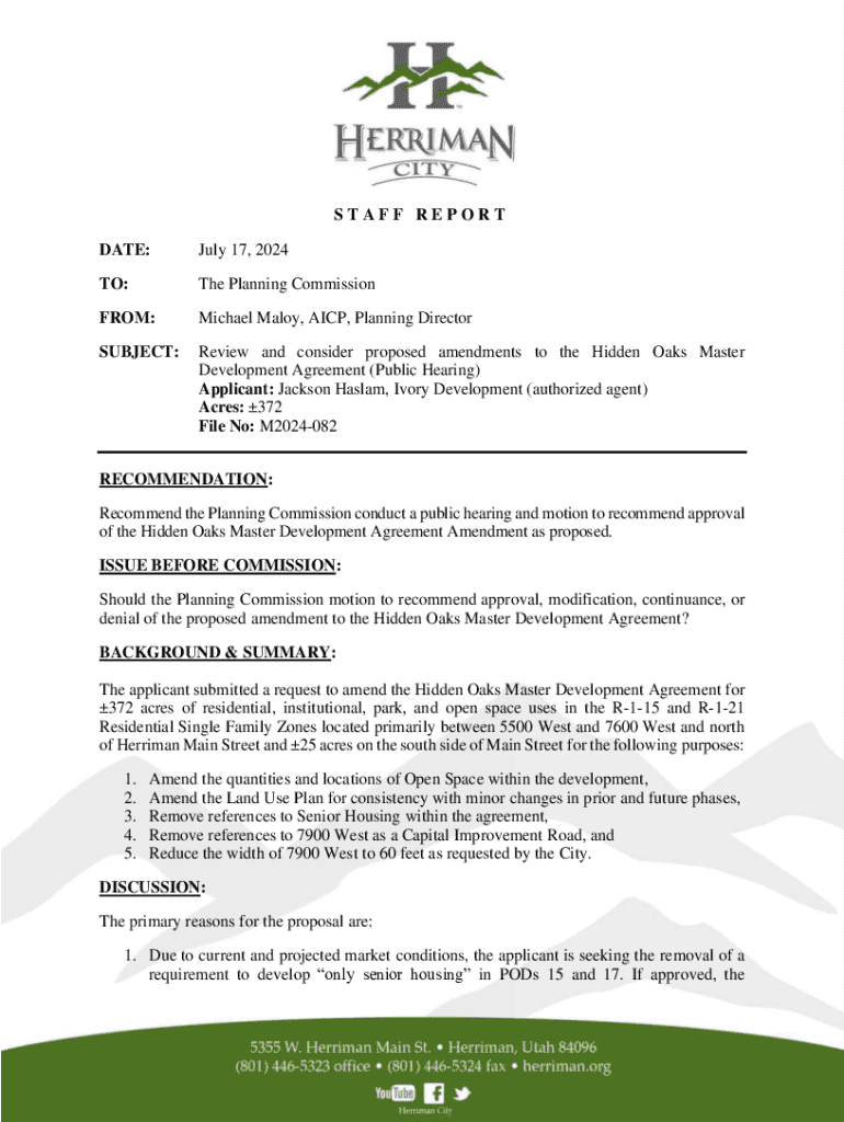 STAFF REPORT DATE:July 17, 2024TO:The Planning CommissionFROM:Michael Maloy, AICP, Planning DirectorSUBJECT:Review and consider proposed amendments to the Hidden Oaks Master Development Agreement
